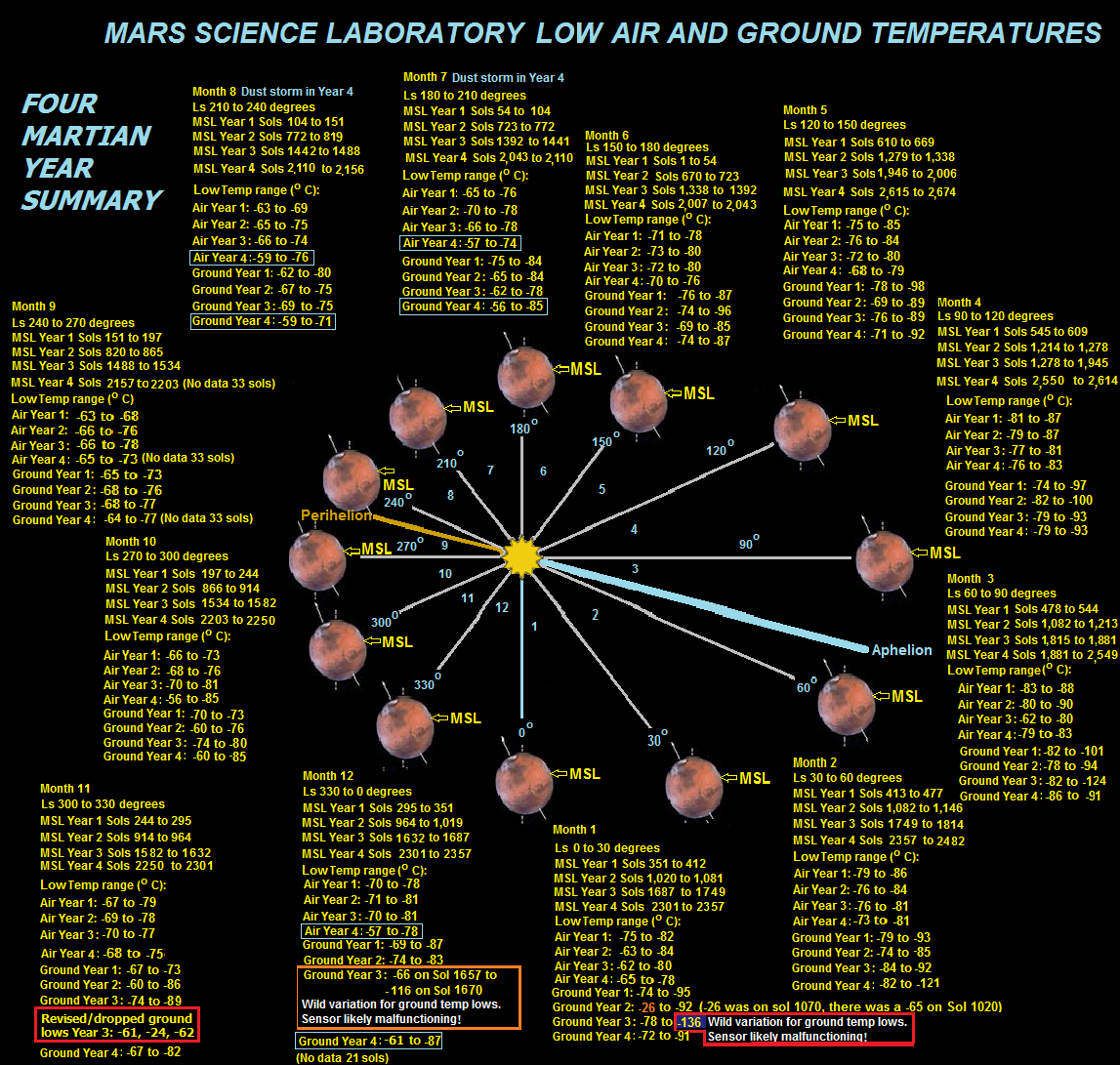 | YEAR 1 SOL | ~LS | Min Air Temp. °C Yellow background = change in low temp > 10°C from one sol to the next. Orange background = low temp -65°C or warmer. Green background low = -65 °C to -69 °C Bright blue background = low 100°C or colder. | Min Ground Temp °C Yellow background = change in low temp > 10°C from one sol to the next. Orange background = low temp -65°C or warmer. Green background low = -65 °C to -69 °C Bright blue background = low 100°C or colder. | YEAR 2 SOL | ~LS | Min Air Temp °C Yellow background = change in low temp > 10°C from one sol to the next. Orange background = low temp -65°C or warmer. Green background low = -65 °C to -69 °C Bright blue background = low 100°C or colder. | Min Ground Temp °C Yellow background = change in low temp > 10°C from one sol to the next. Orange background = low temp -65°C or warmer. Green background low = -65 °C to -69 °C Bright blue background = low 100°C or colder. | Δ Air Low Red background = >10°C warmer in Year 2 than in Year 1, blue background = <10°C colder in Year 2 than in Year 1. | Δ Ground Low Red background = >10°C warmer in Year 2 than in Year 1, blue background = <10°C colder in Year 2 than in Year 1. |