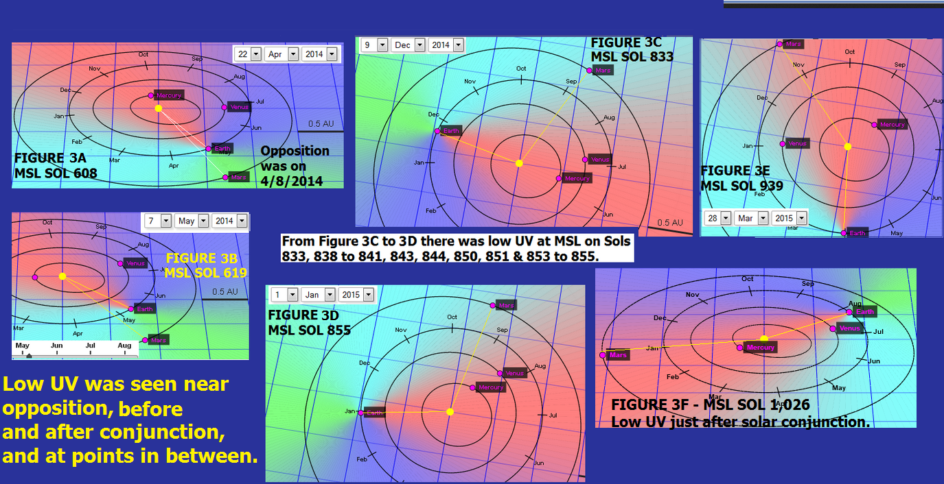 Using an interactive 3D Diagram of the Solar System available at https://in-the-sky.org/solarsystem.php, at first look it appeared that, as is shown in Figures 3A to 3F, it did not appear that there is a correlation between UV and the relative positions of Mars and Earth in their orbits around the sun (at least with respect to when Gale Crater, Mars was experiencing low UV).